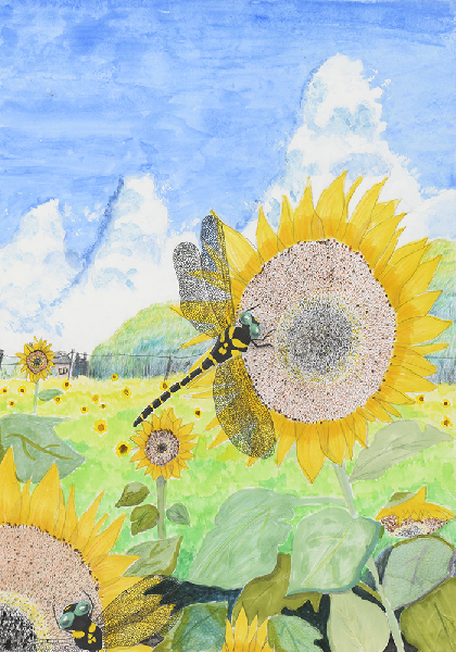 ひまわり畑にオニヤンマ